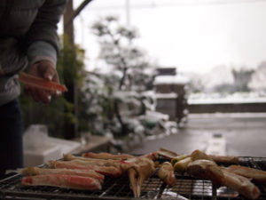 私は隣で親戚の人が持ってきた氷漬けのカニを