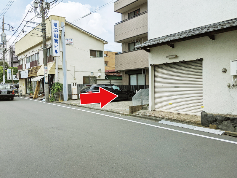 左に曲がってすぐの、二つのパーキングの間にある道をお進みください。