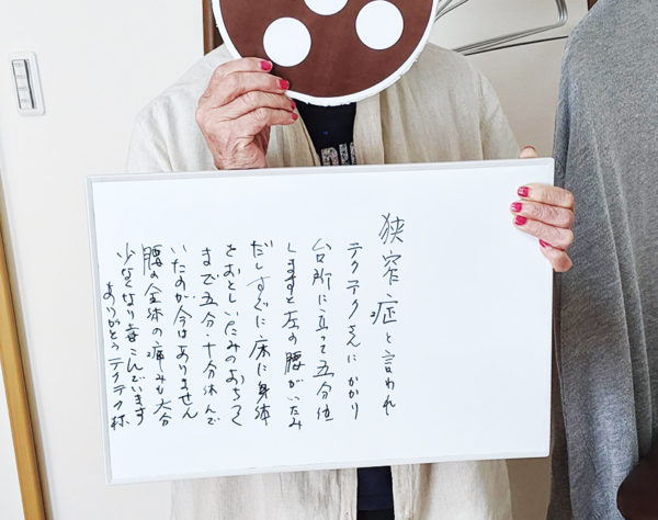 狭窄症と言われ、てくてくさんにかかり 台所に立って5分くらいしますと 左の腰が痛みだしすぐに床に身体をおとし 痛みの落ち着くまで5分10分休んでいたのが今はありません。 腰の全体の痛みも大分少なくなり喜んでおります。 ありがとう。